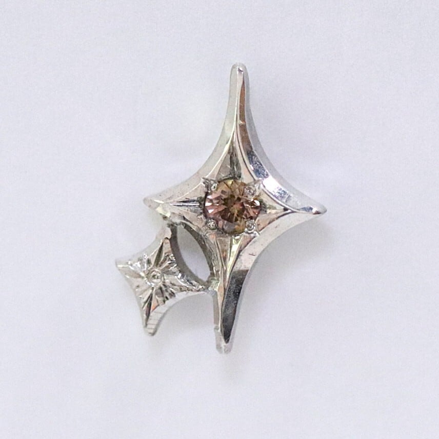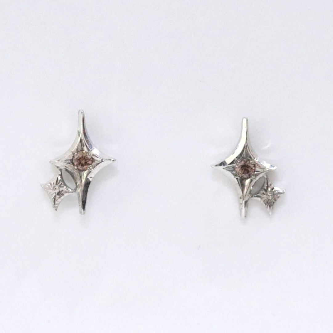 四芒星をモチーフにしたピアスです。大きいパーツには五光留めでサファイアを留めて、小さいパーツにはタガネで彫りを入れています。五光留めや彫りが入っており細部までこだわっている、普段使いにおすすめのデザインです。シャンパンレッドパープルカラーという珍しい色のサファイアを留めています。