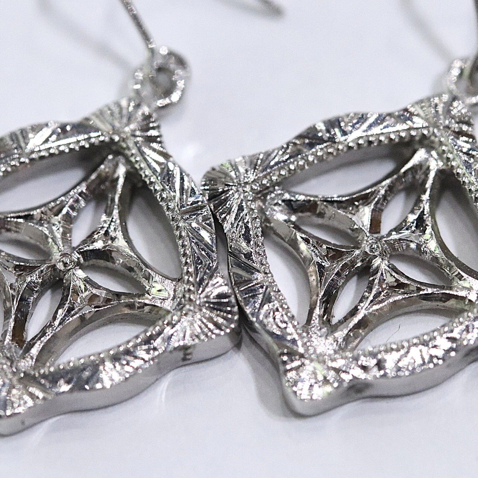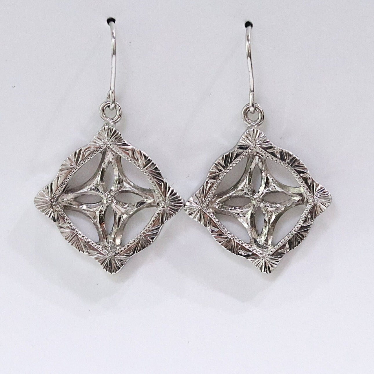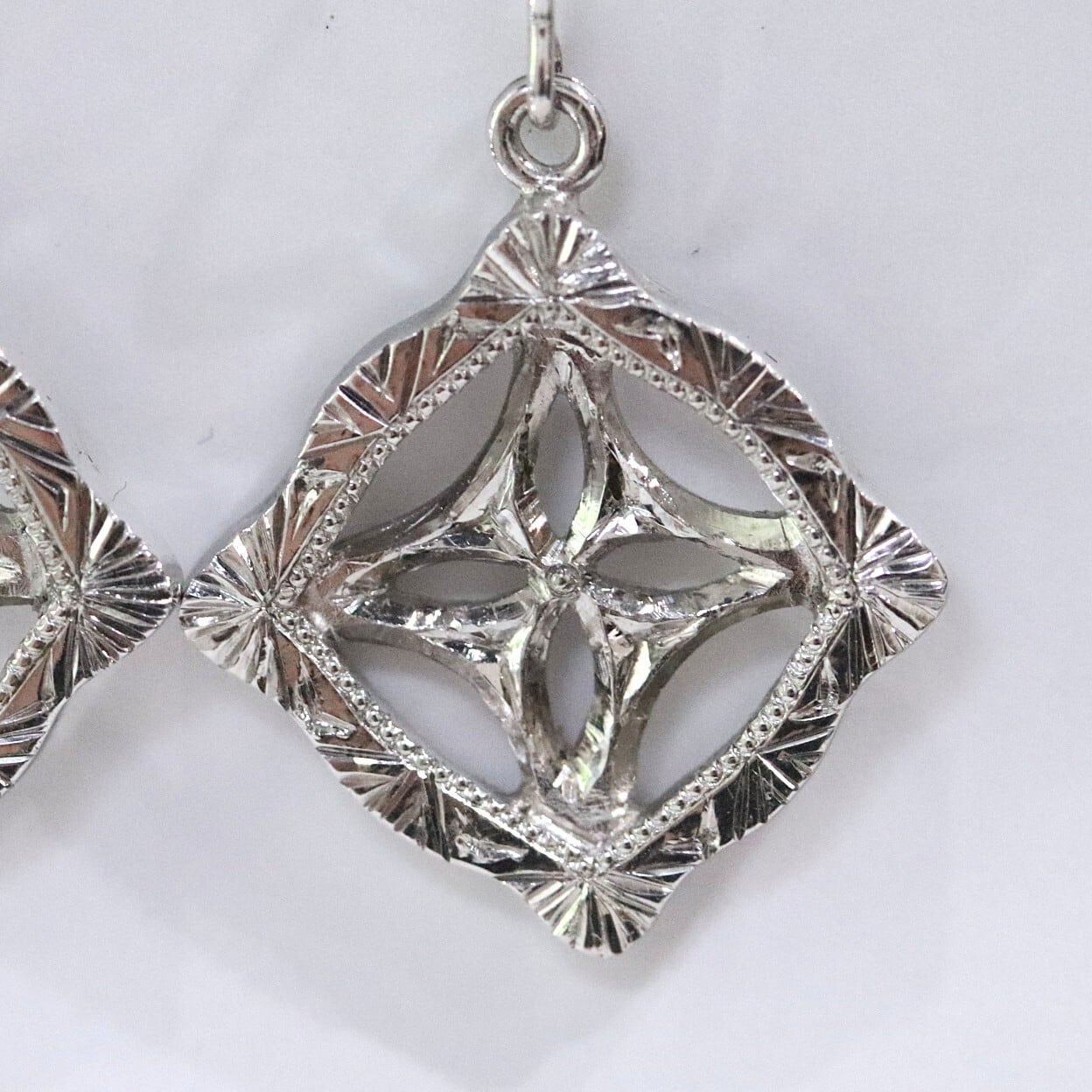 イタリアの伝統技法フィレンツェ彫り施したピアスです。額縁のような形をイメージして、そこに細かい彫りとミルグレインが施してあります。