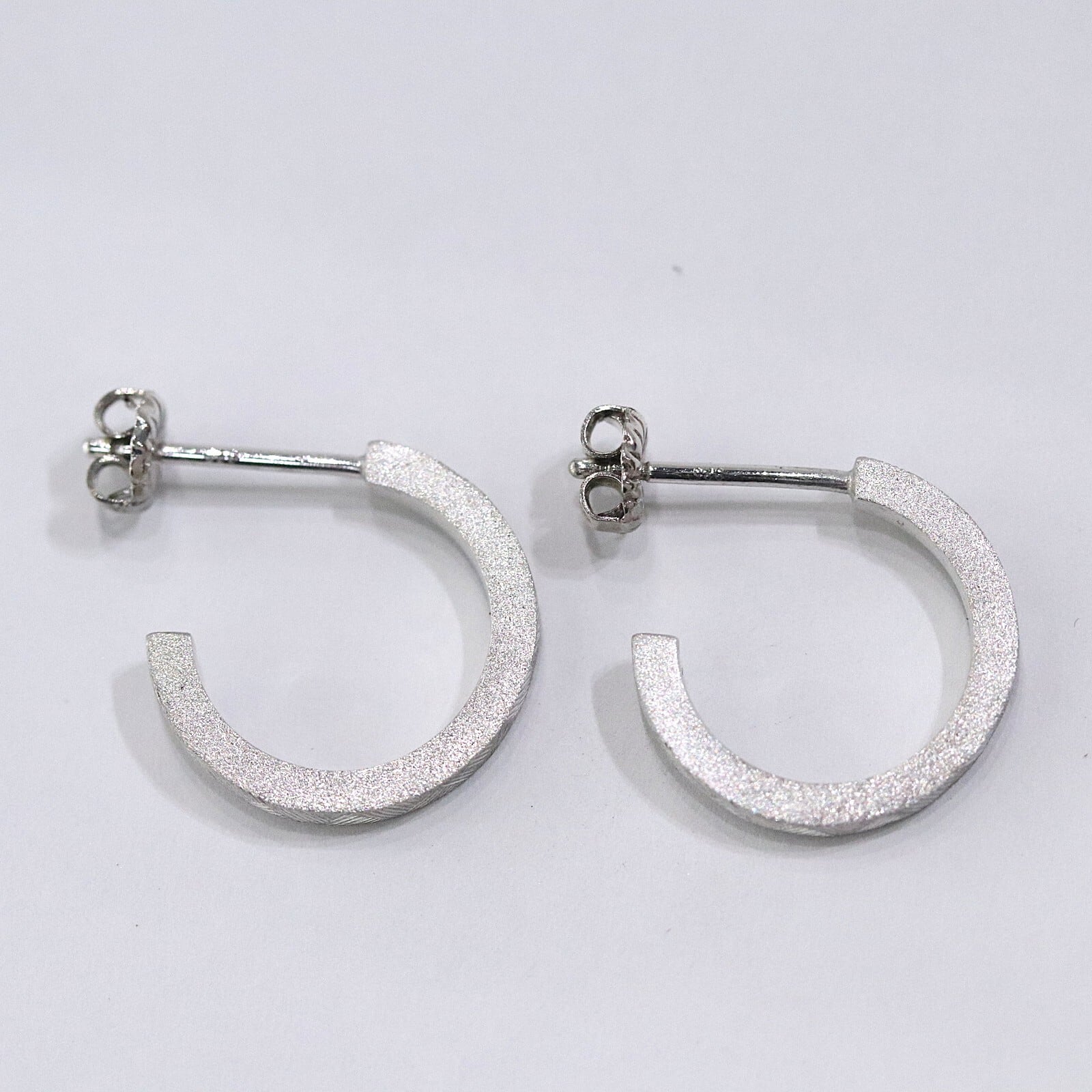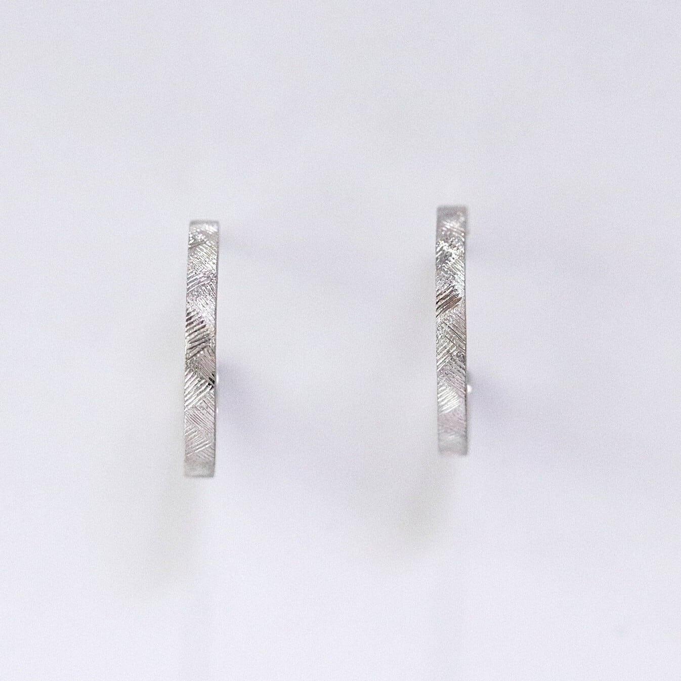 シンプルなフープ型に筋彫りを施しています。つや消しの地金に彫り跡がキラキラと輝きます。上品な輝きで普段使いにおすすめです。