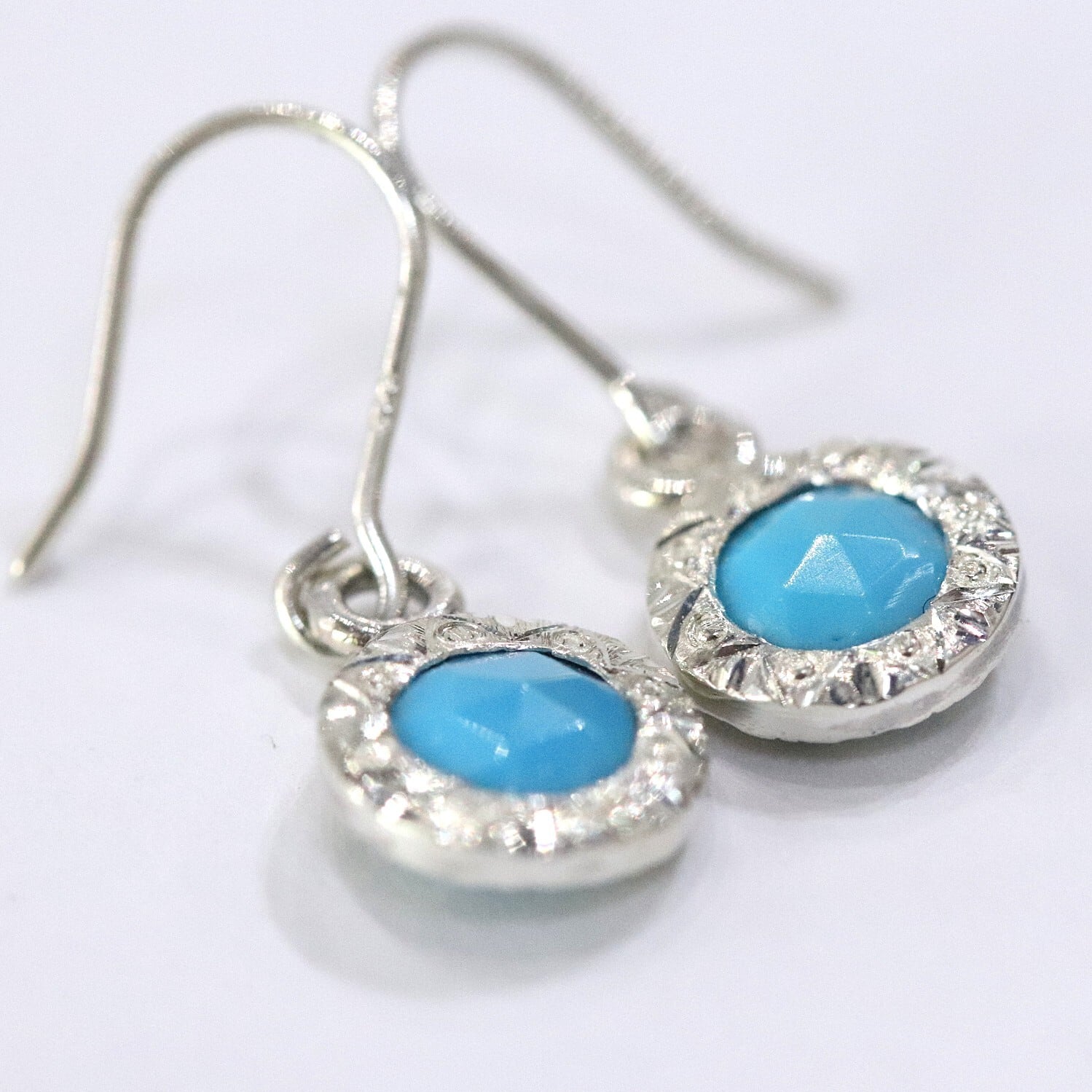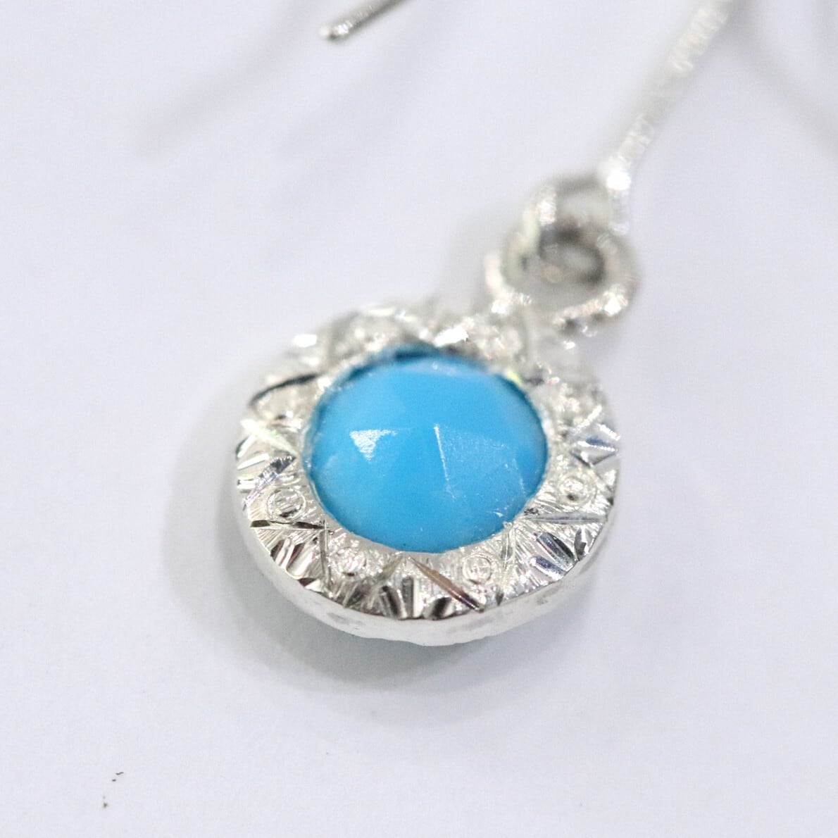 イタリアの伝統技法フィレンツェ彫り施したピアスです。ローズカットのターコイズなので綺麗なカットが隠れないよう裏表両方からフクリン留めをしています。そして細かい彫りの装飾が裏面にも施されています。裏表のないような作りになっています。