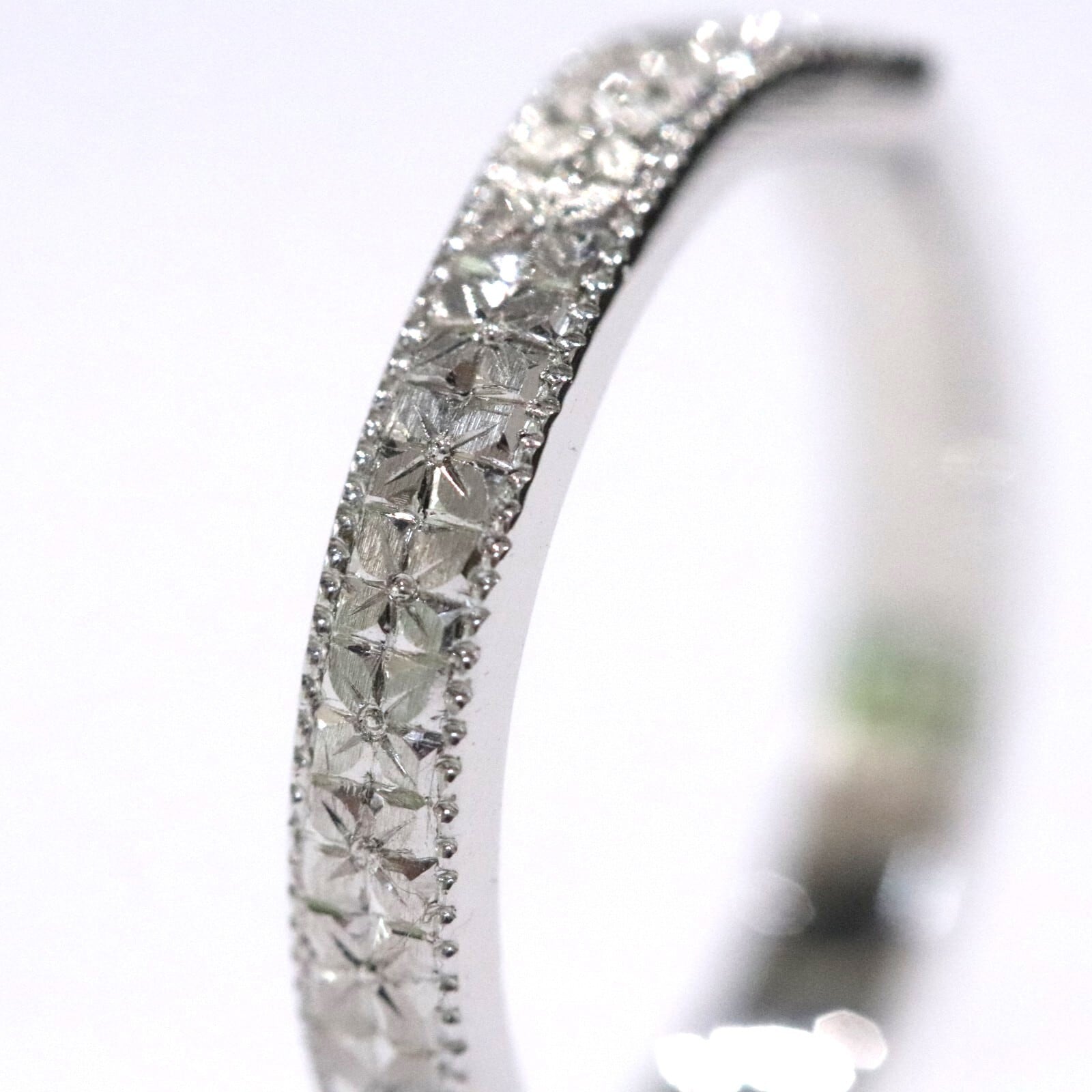 Vラインのリングに、日本の伝統技法である和彫りの勿忘草をイメージして彫ったリングになります。