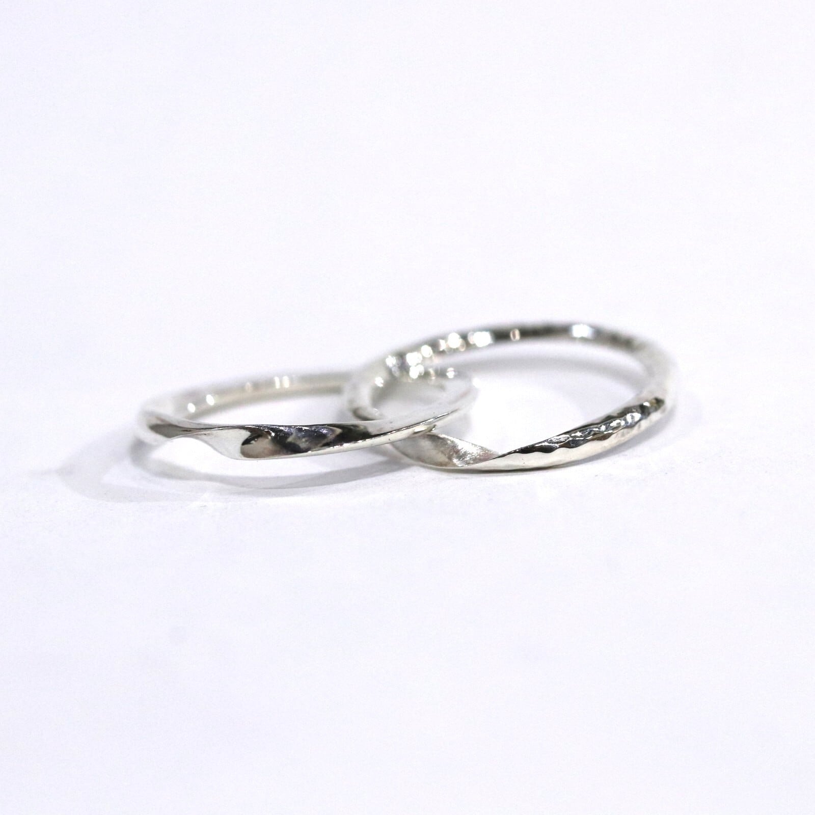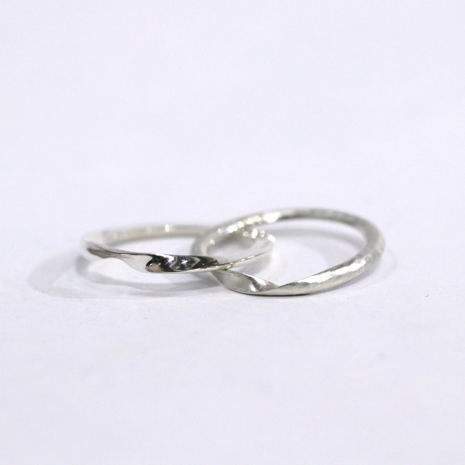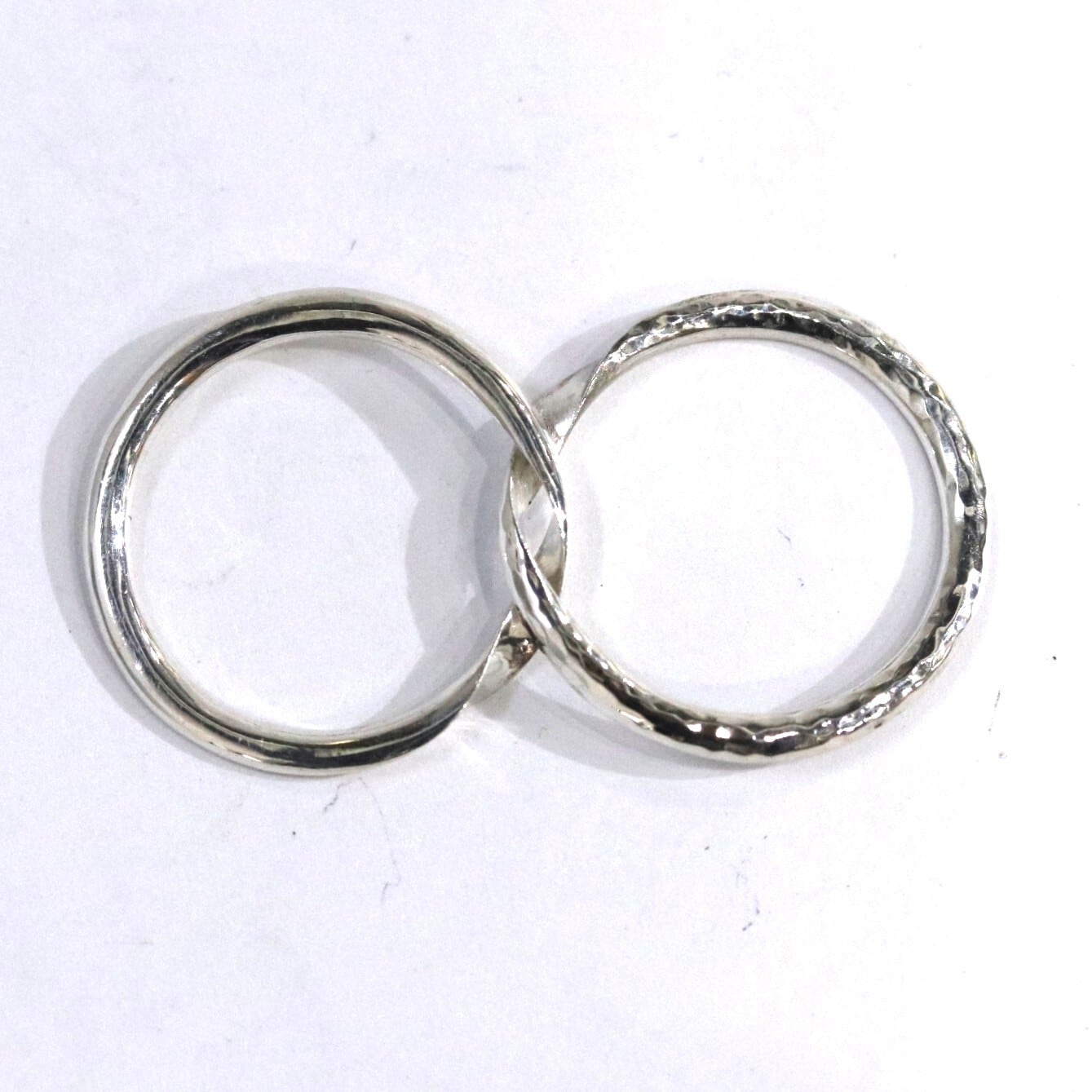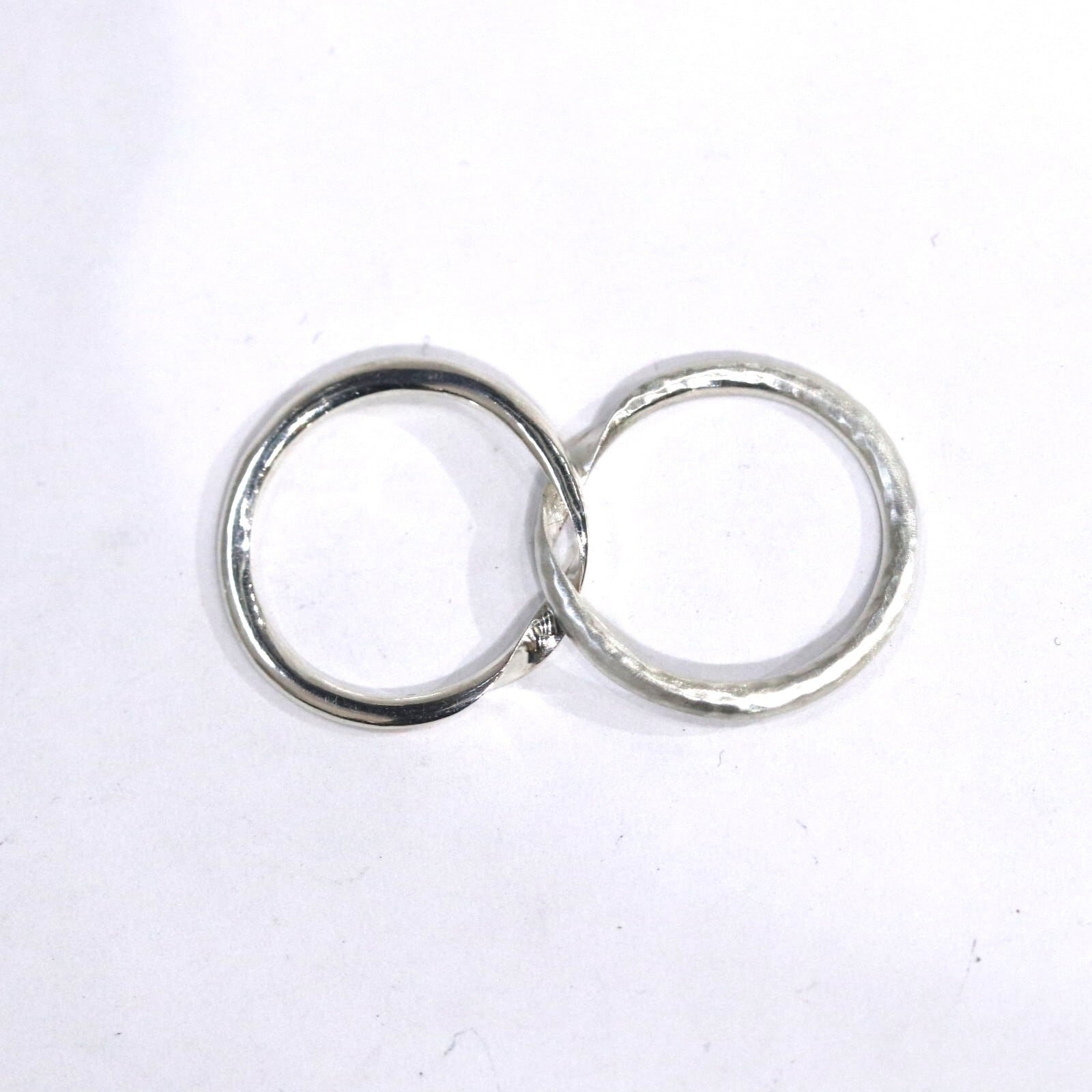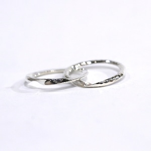 ギメルリングとは、 ラテン語で「双子」を意味し、二つのリングを重ね合わせることで完成するリングです。「離れることのない二人」や「命の結合」を象徴します。こちらのギメルリングは甲丸線を2本重ねることで丸い形になっています。片方の指輪にハンマーで模様を付けた槌目模様が入っています。