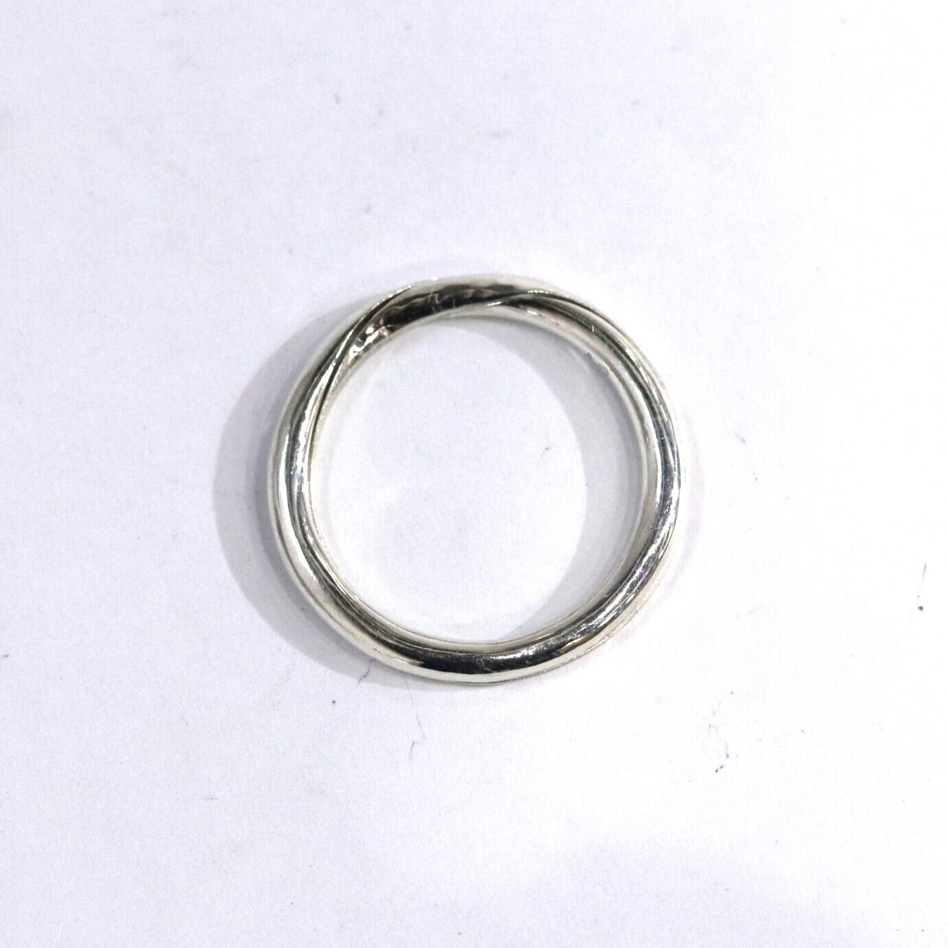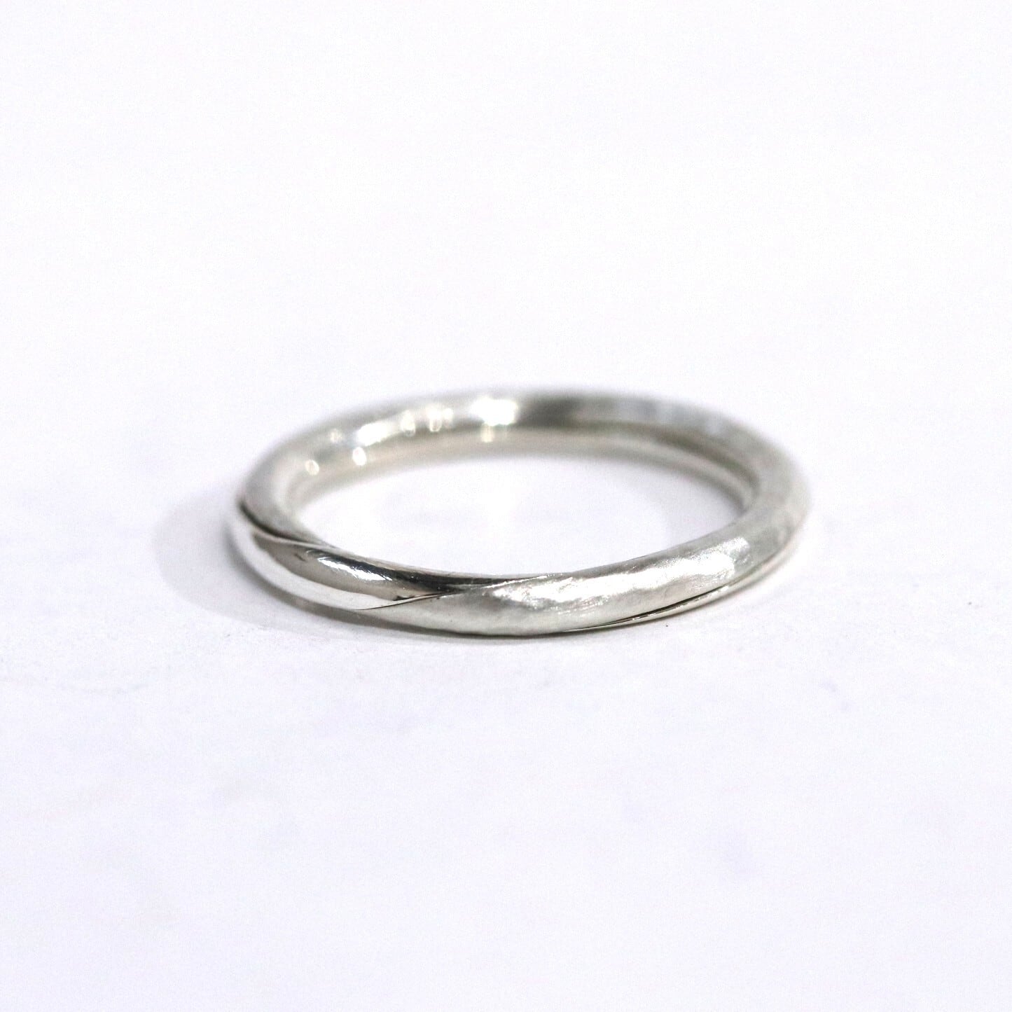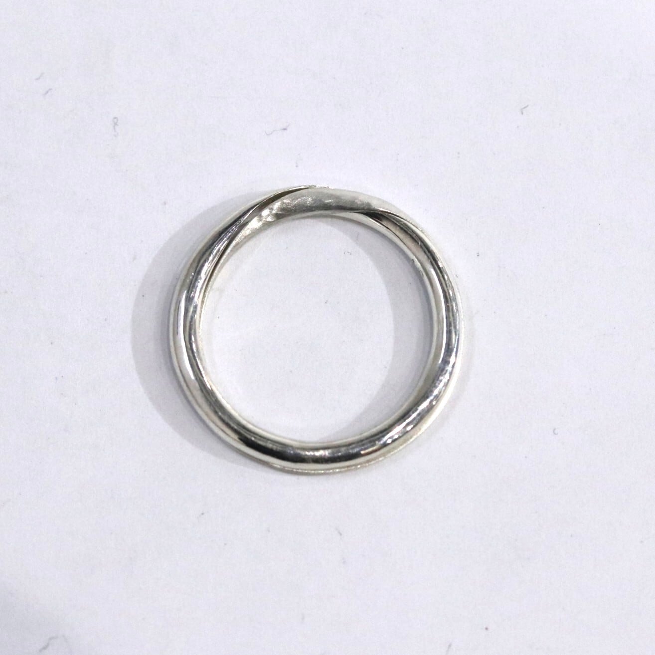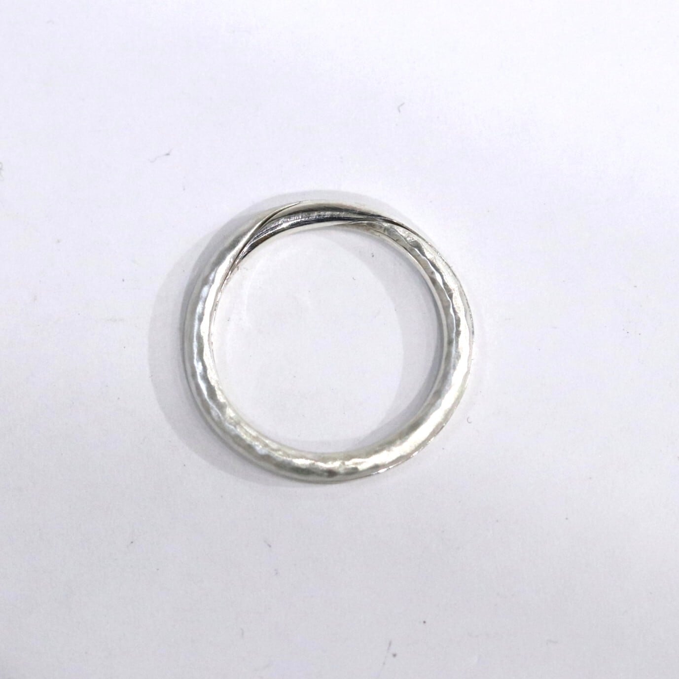 ギメルリングとは、 ラテン語で「双子」を意味し、二つのリングを重ね合わせることで完成するリングです。「離れることのない二人」や「命の結合」を象徴します。こちらのギメルリングは甲丸線を2本重ねることで丸い形になっています。片方の指輪にハンマーで模様を付けた槌目模様が入っています。