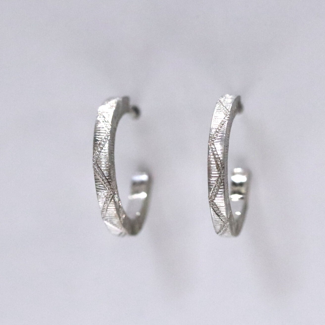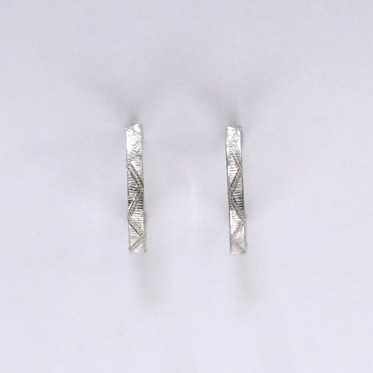 シンプルなフープ型に筋彫りを施しミルグレインをジグザグに入れてあります。シンプルですが他とは被らないデザインです。