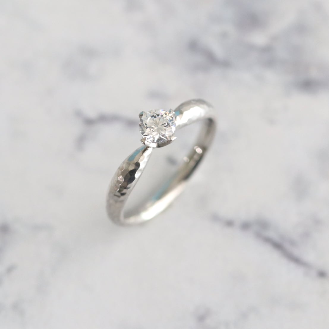 4本爪でダイヤモンドをセッティングした婚約指輪です。アームデザインはふっくらとした面になっていて、槌目模様をつけております。表面がキラキラと輝きとてもきれいです。スタイリッシュなデザインのため、普段からカジュアルにお着けいただけると思います。