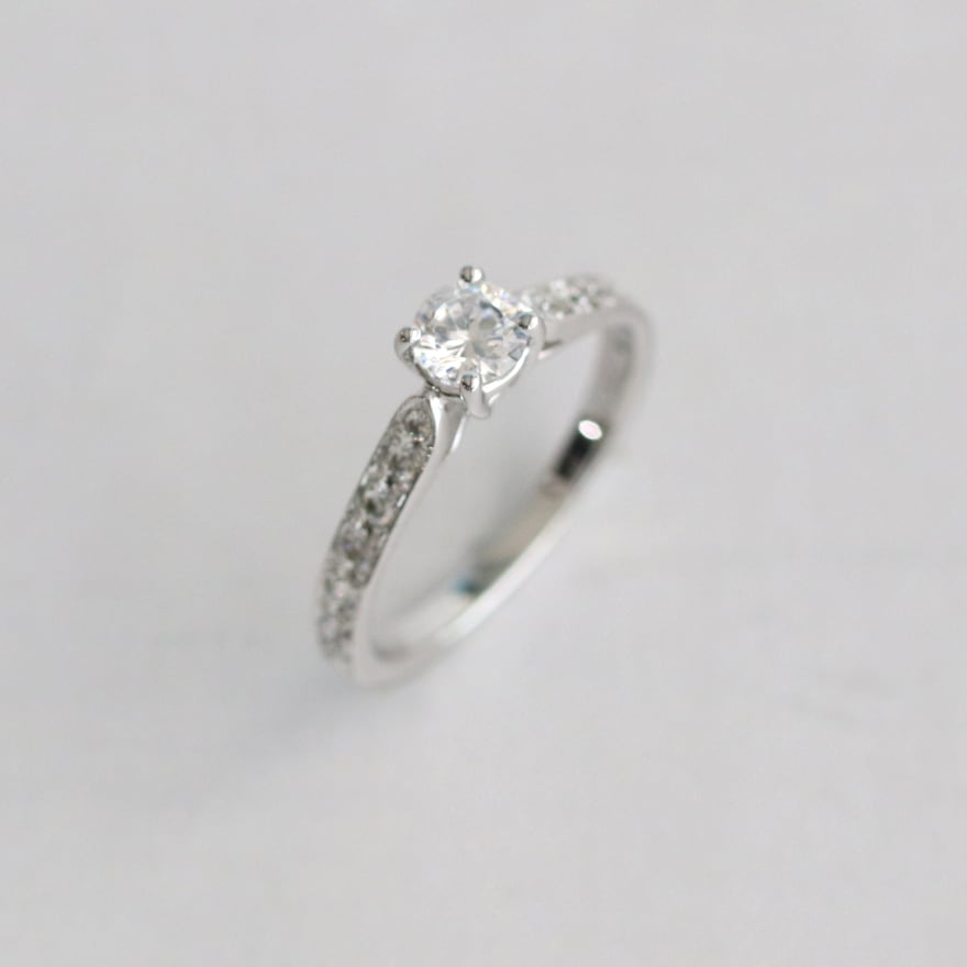 4本爪でダイヤモンドをセッティングした婚約指輪です。アームデザインはストレートラインでスタイリッシュなデザインになっております。アーム部分には、ダイヤモンドを贅沢に14ピースセッティングしゴージャスな仕上がりになっております。