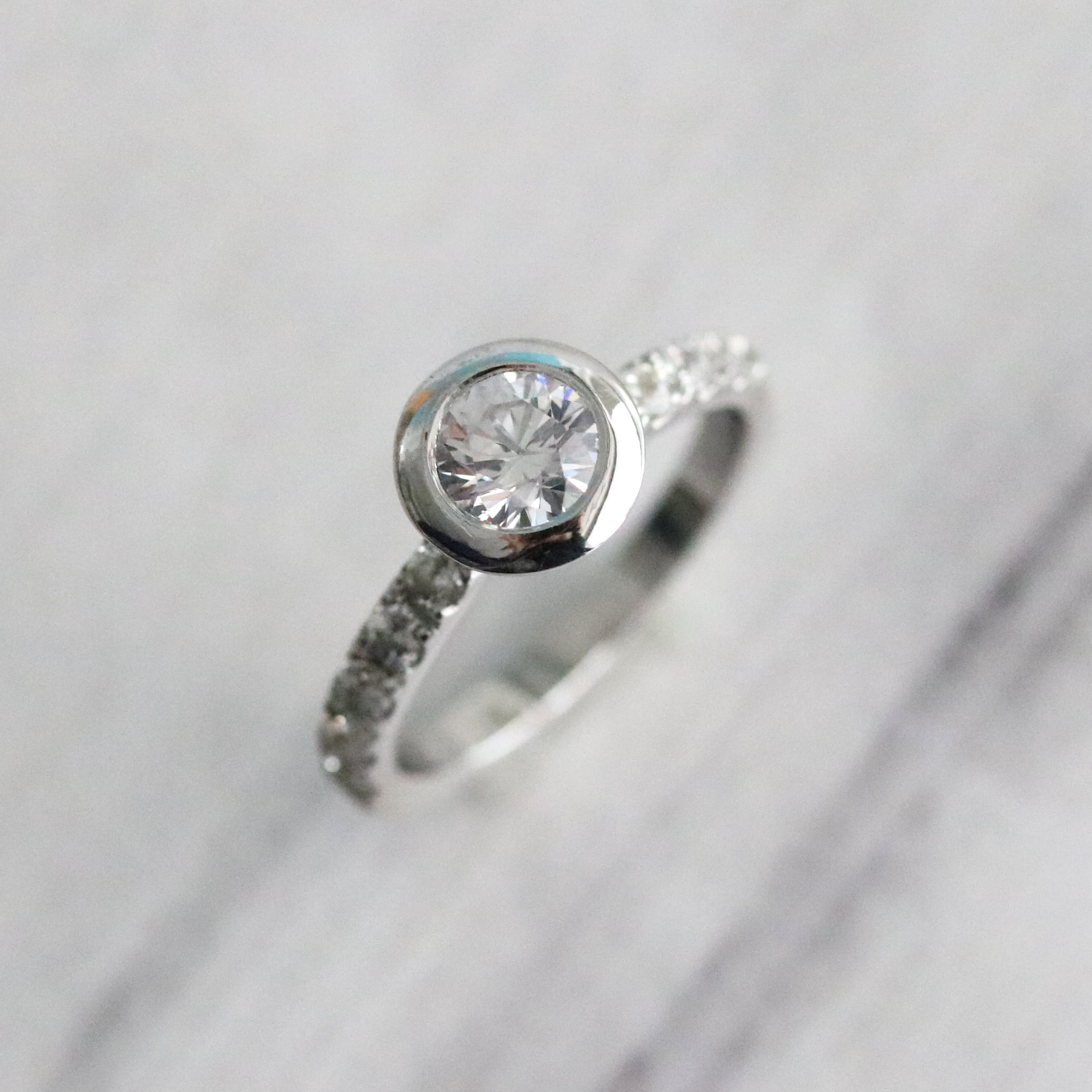 ラウンド型のフレームで囲ってセンターダイヤモンドをセッティングしております。