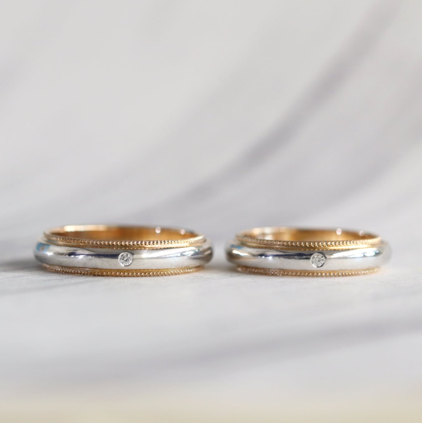 【結婚指輪】甲丸_ダブル2カラー_ミルグレイン_ベース4.0mm_ダイヤモンド1P Pt900×K18PG