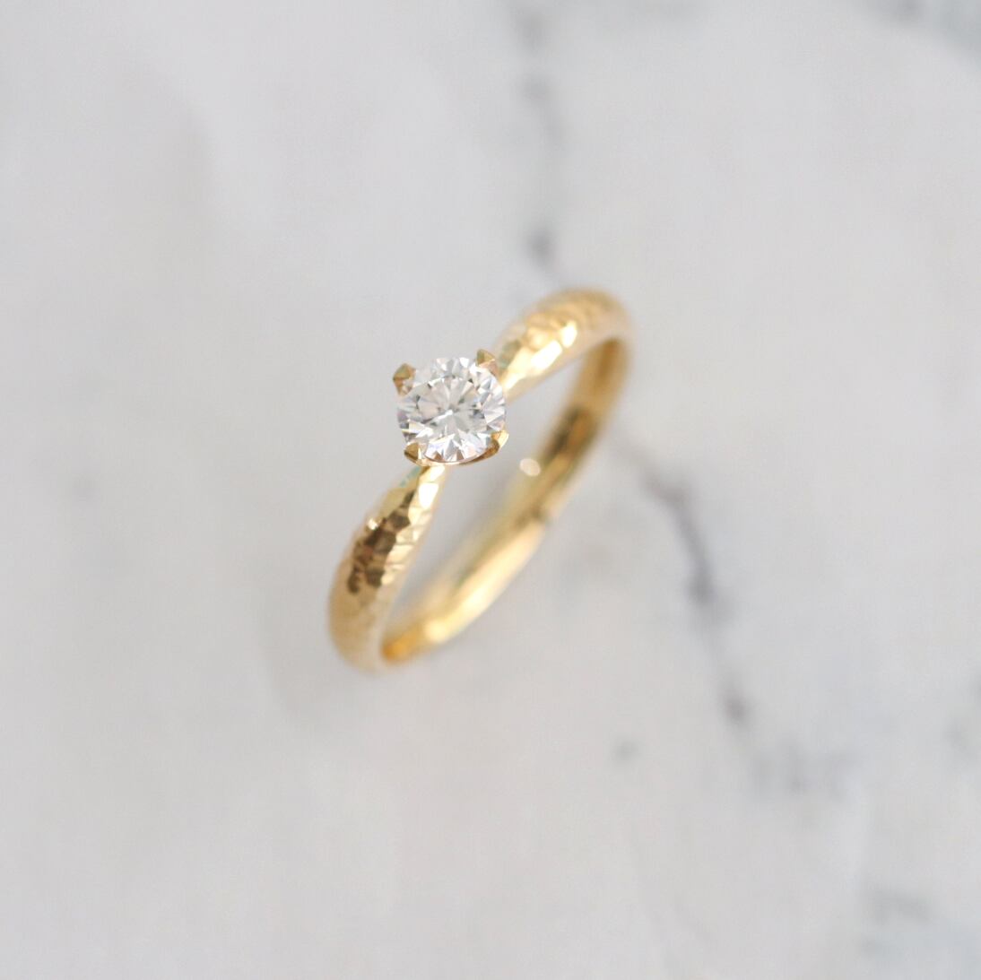 4本爪でダイヤモンドをセッティングした婚約指輪です。アームデザインはふっくらとした面になっていて、槌目模様をつけております。表面がキラキラと輝きとてもきれいです。スタイリッシュなデザインのため、普段からカジュアルにお着けいただけると思います。