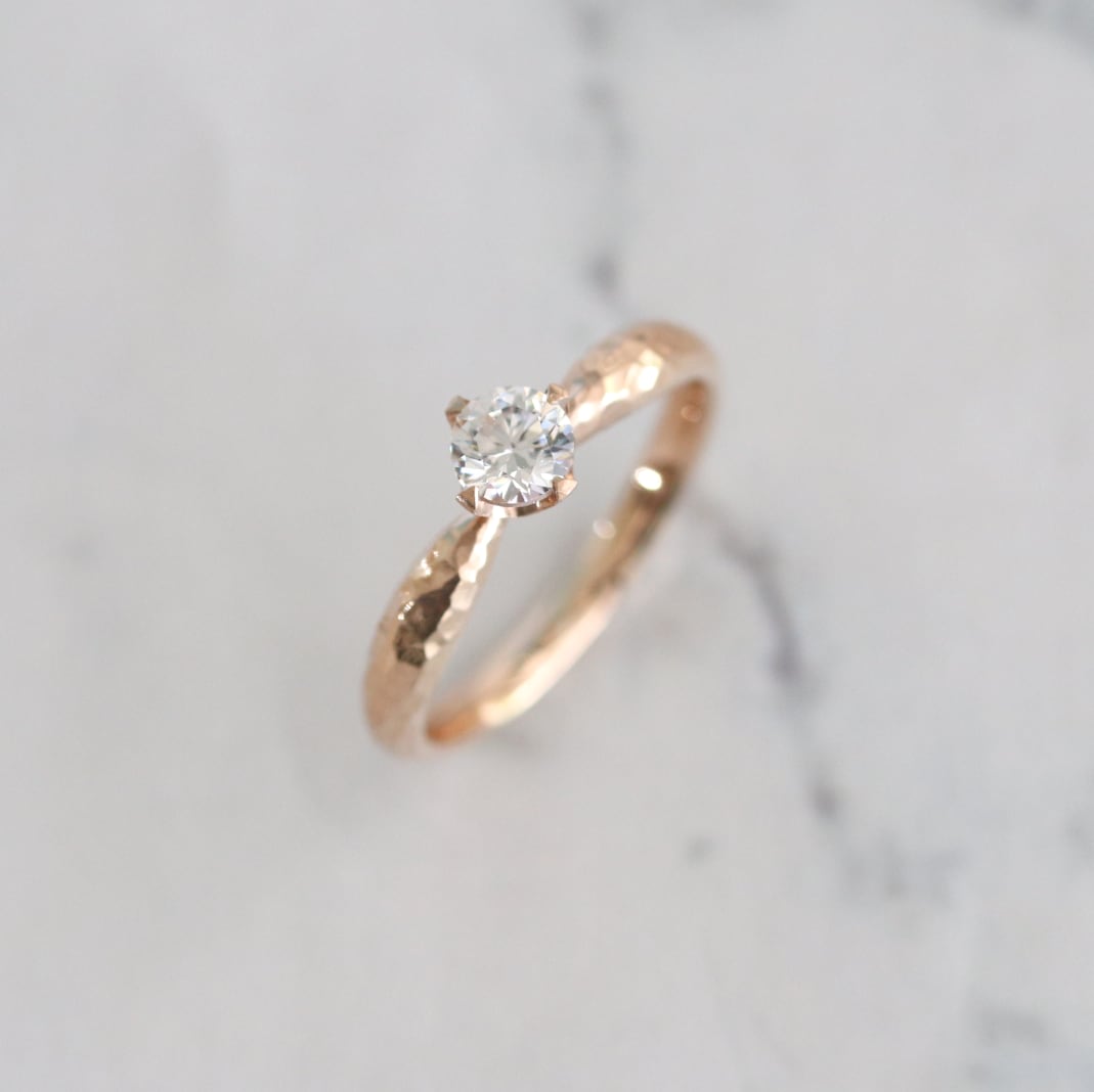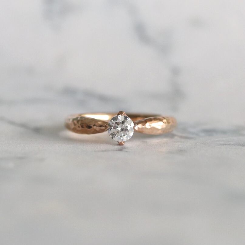 4本爪でダイヤモンドをセッティングした婚約指輪です。アームデザインはふっくらとした面になっていて、槌目模様をつけております。表面がキラキラと輝きとてもきれいです。スタイリッシュなデザインのため、普段からカジュアルにお着けいただけると思います。