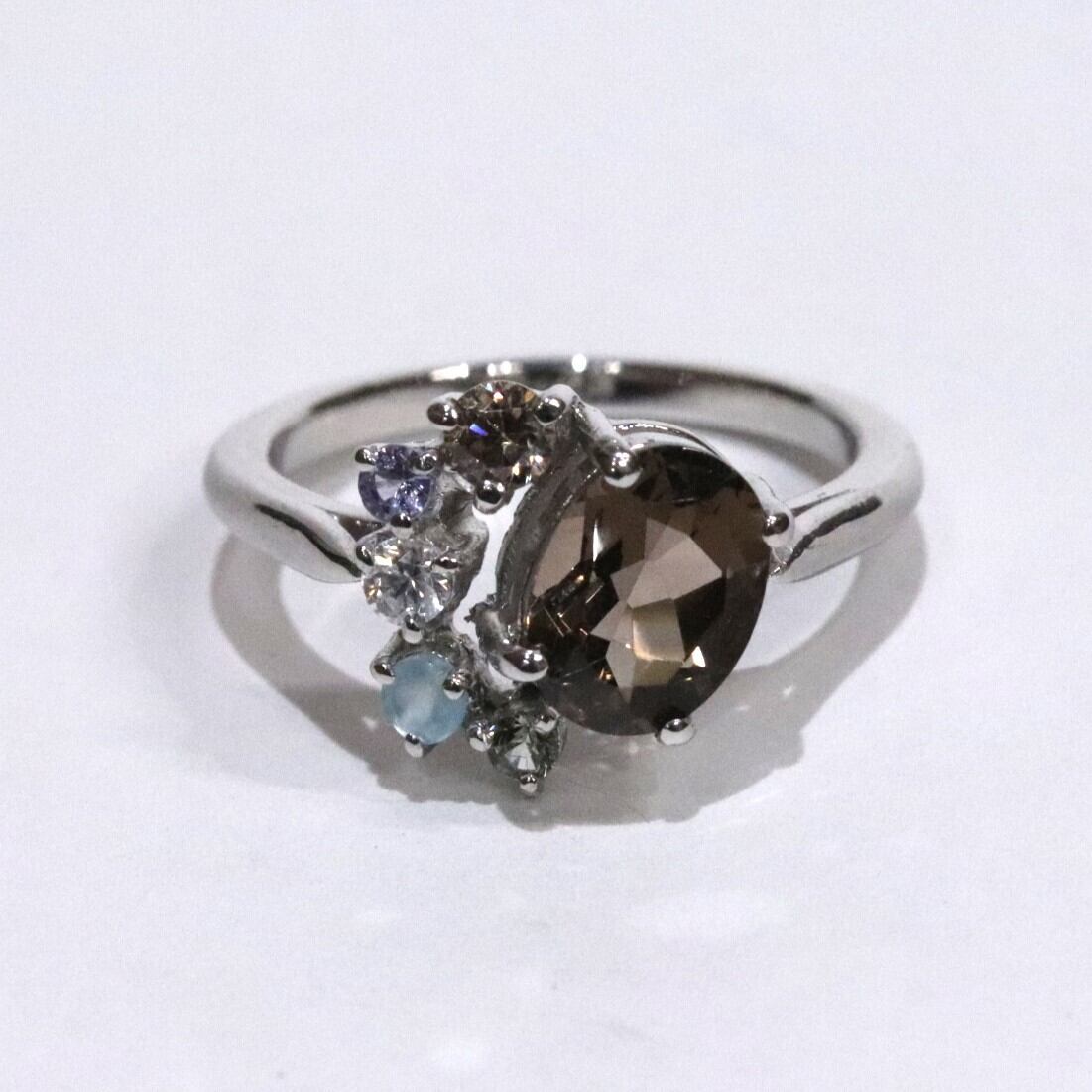 スモーキークォーツをメインの石に使ったファッションリングです。大小様々な宝石を使い華やかなリングです。落ち着いたカラーなので普段使いにもおすすめです。スモーキークォーツ、シャンパンジルコン、タンザナイト、ホワイトジルコン、グリーンサファイア、アパタイトを使用しています。