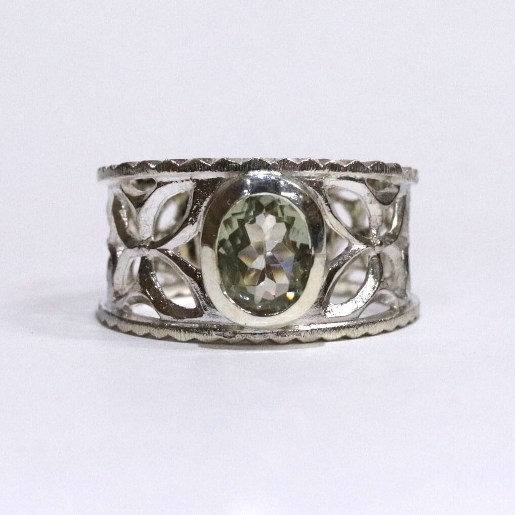 イタリアの伝統技法フィレンツェ彫りをイメージしたファッションリングです。幅広のリングに大ぶりのシリマナイトをフクリン留めしているので、存在感があります。細かい透かしや彫りが細部まで施されています。