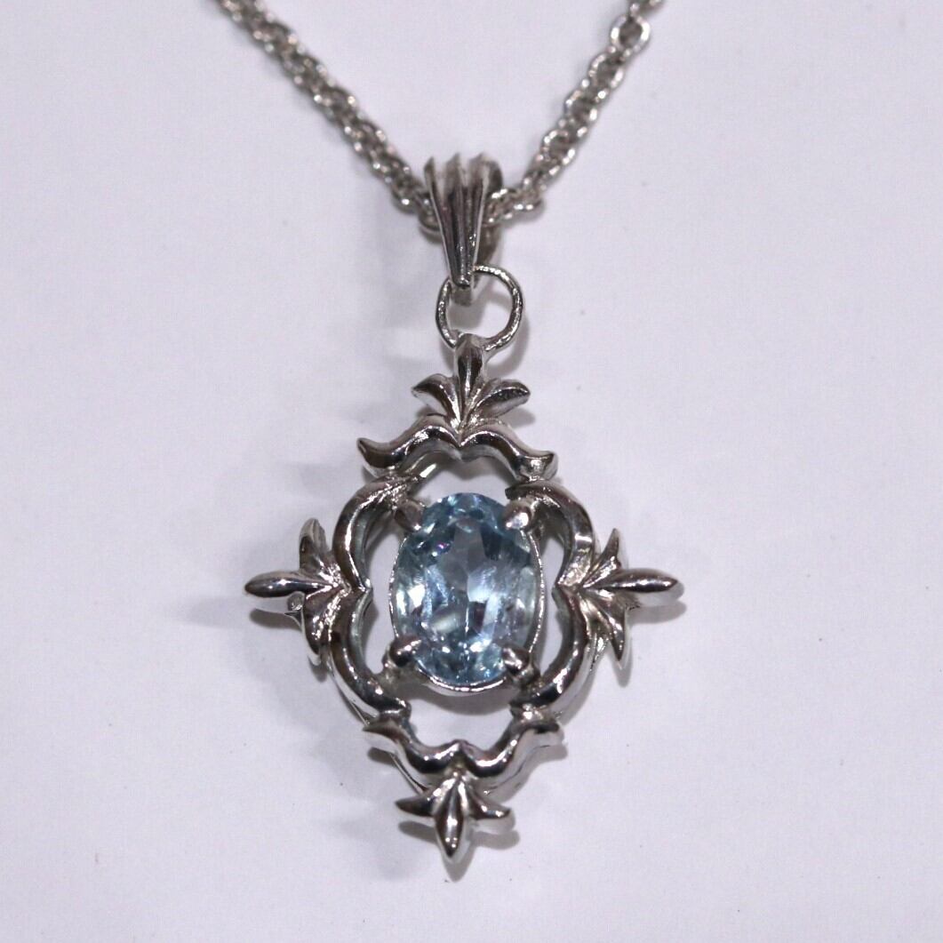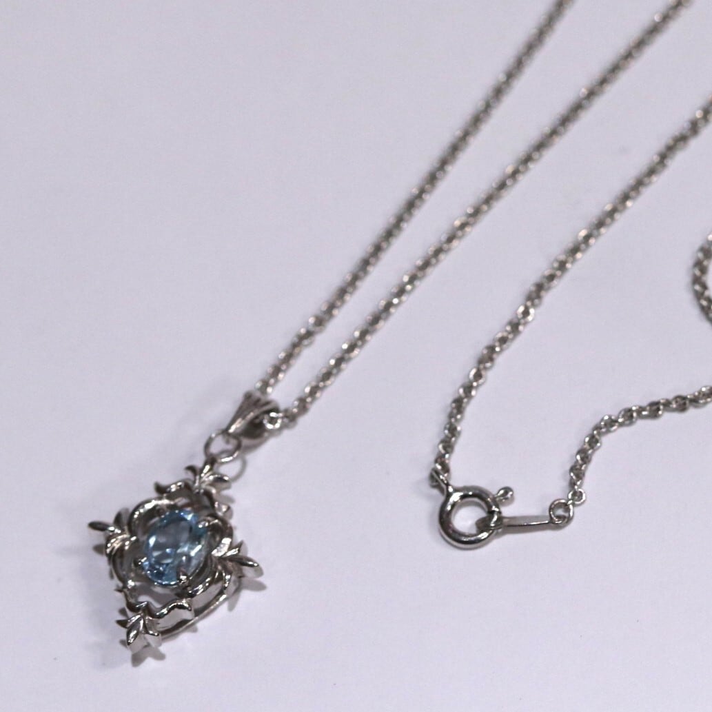 唐草をイメージした装飾が目を引くデザインのペンダントです。存在感がありながら、派手過ぎないので普段使いにもおすすめです。中央にオーバルのアクアマリンを爪留めしています。