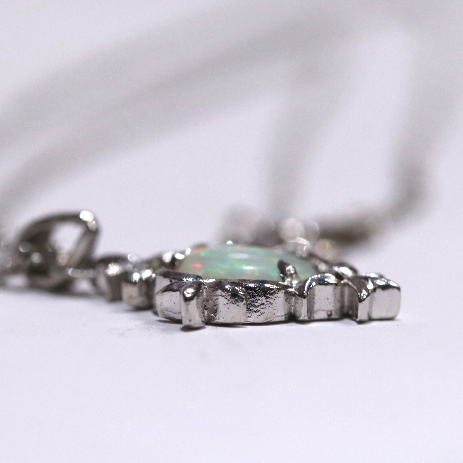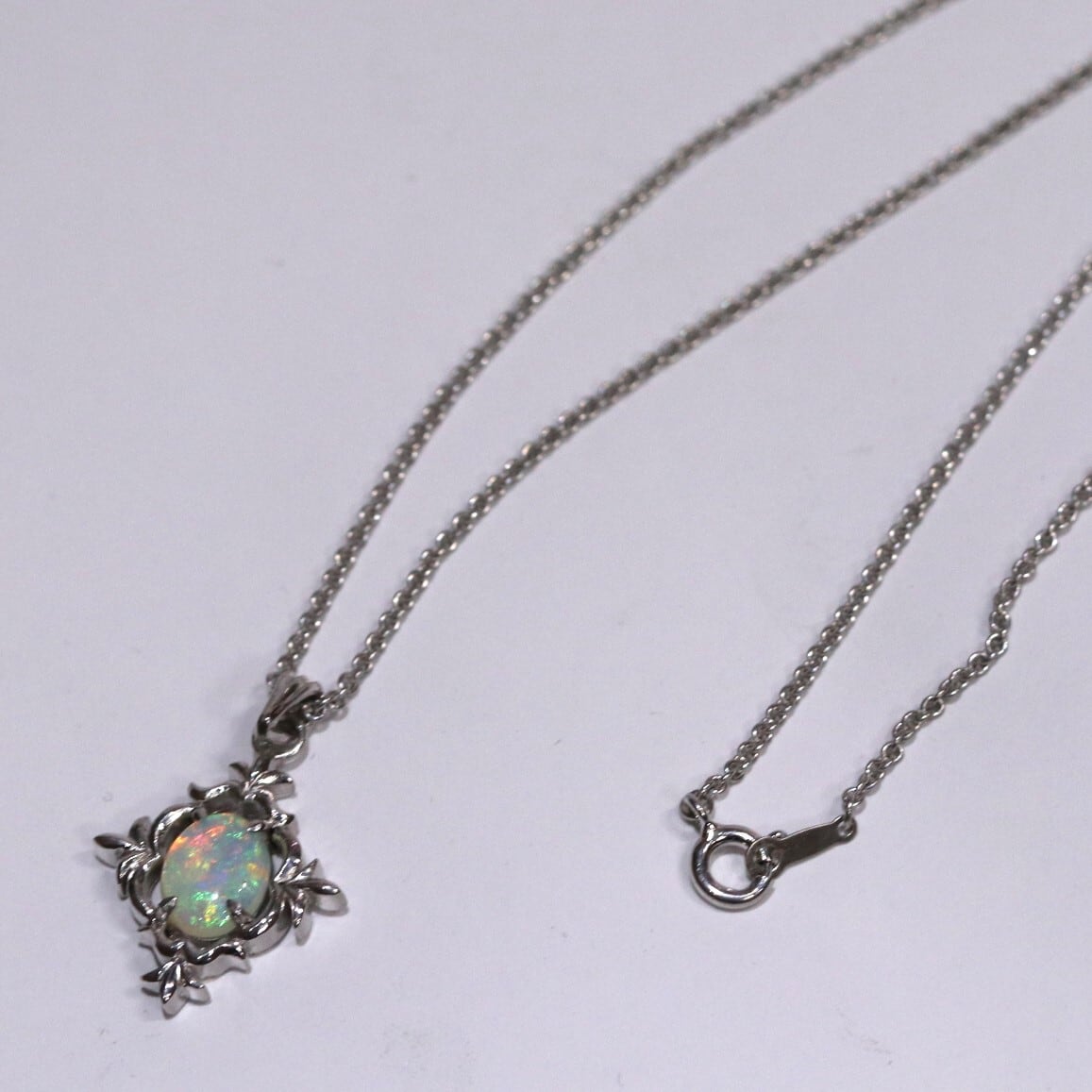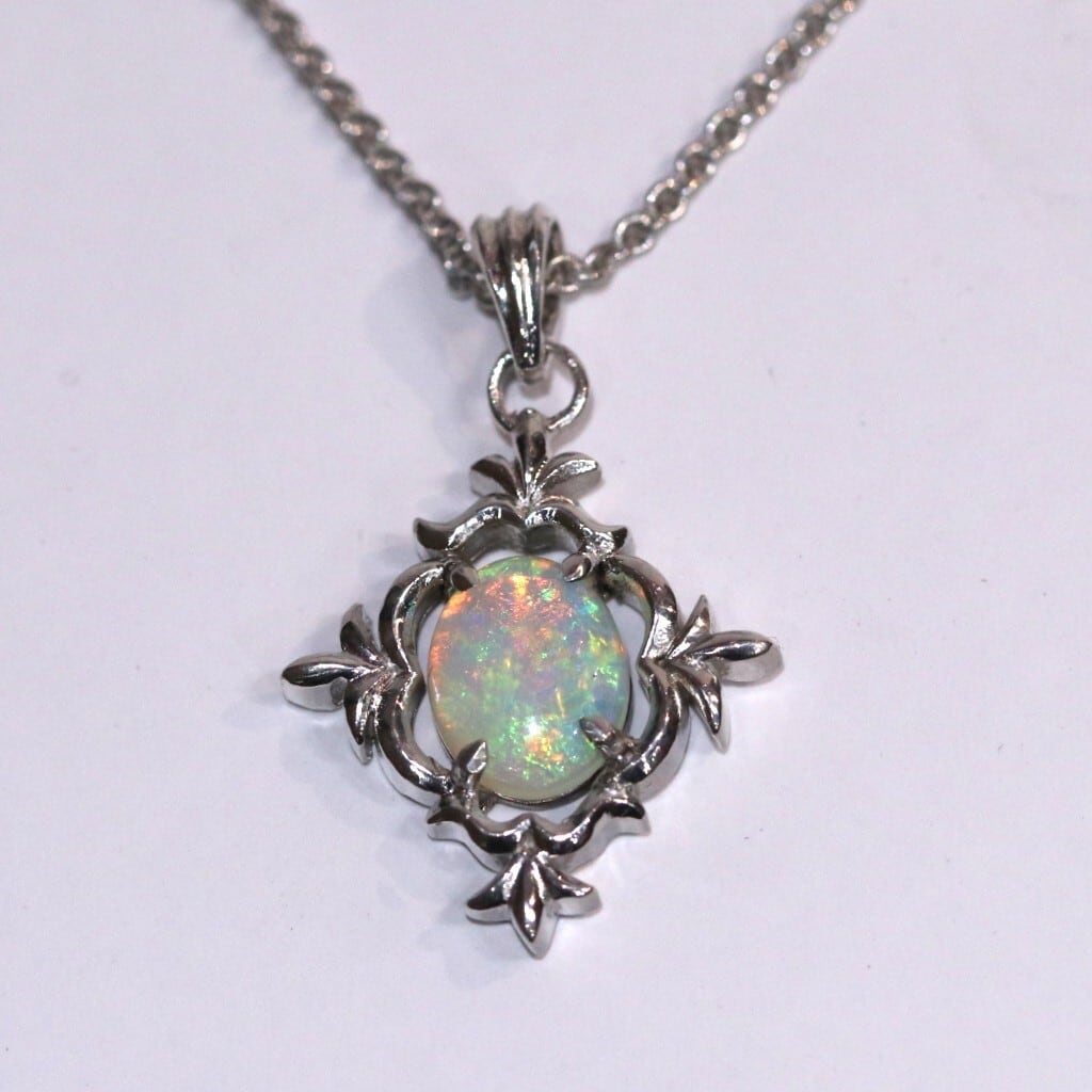 唐草をイメージした装飾が目を引くデザインのペンダントです。存在感がありながら、派手過ぎないので普段使いにもおすすめです。中央にオーバルのオパールを爪留めしています。