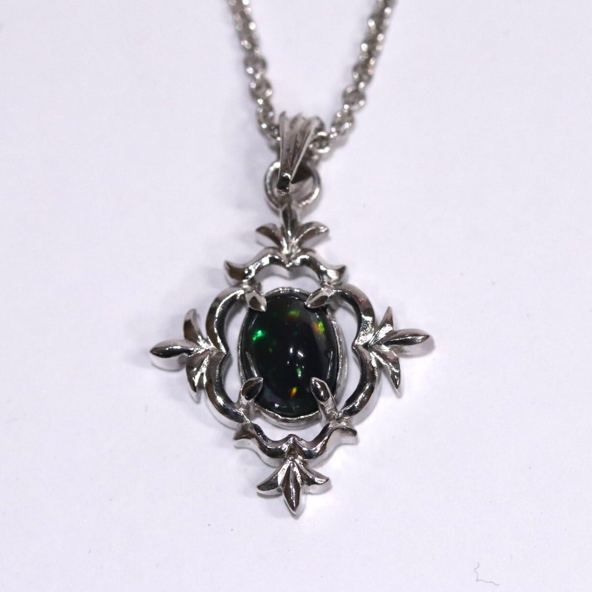 唐草をイメージした装飾が目を引くデザインのペンダントです。存在感がありながら、派手過ぎないので普段使いにもおすすめです。中央にオーバルのブラックオパールを爪留めしています。