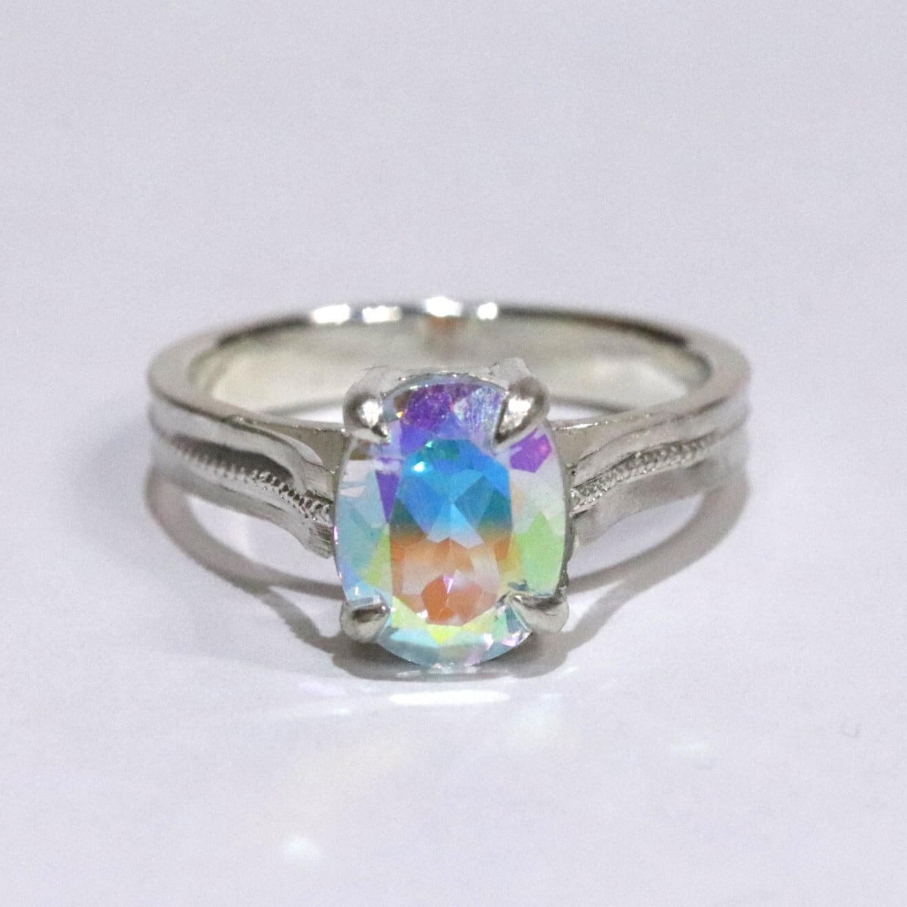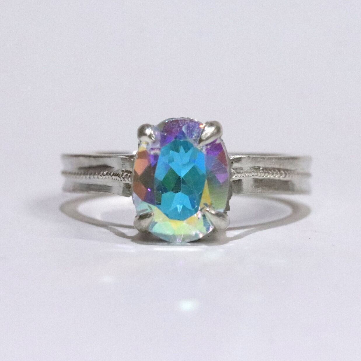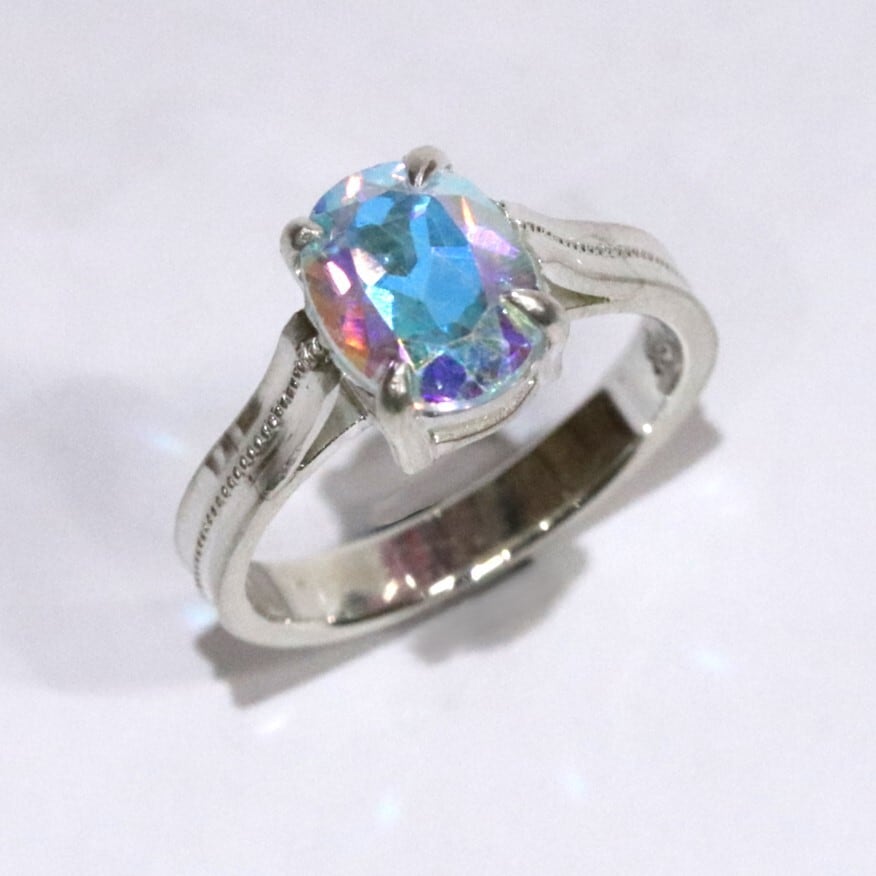 リングの中央にミスティックトパーズをセッティングしたリングです。